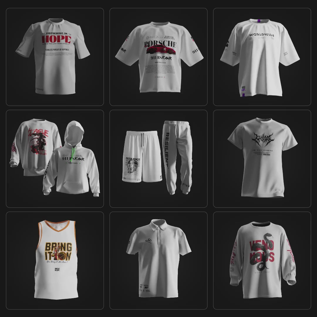 ✅ All 3D Models Included: T-Shirt, Boxy T-Shirt, Oversized T-Shirt, Sport T-Shirt, Hoodie kit, Shorts + Pants Kit, Collared-Shirt, Long Sleeve T-shirt, Tank Top, Caps & Beanie Pack...